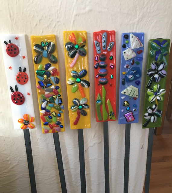 Garden Art can add splash to your existing landscape. After your stake has been fused in the kiln an additional time will be set up for you to come back to take your creation home. Click